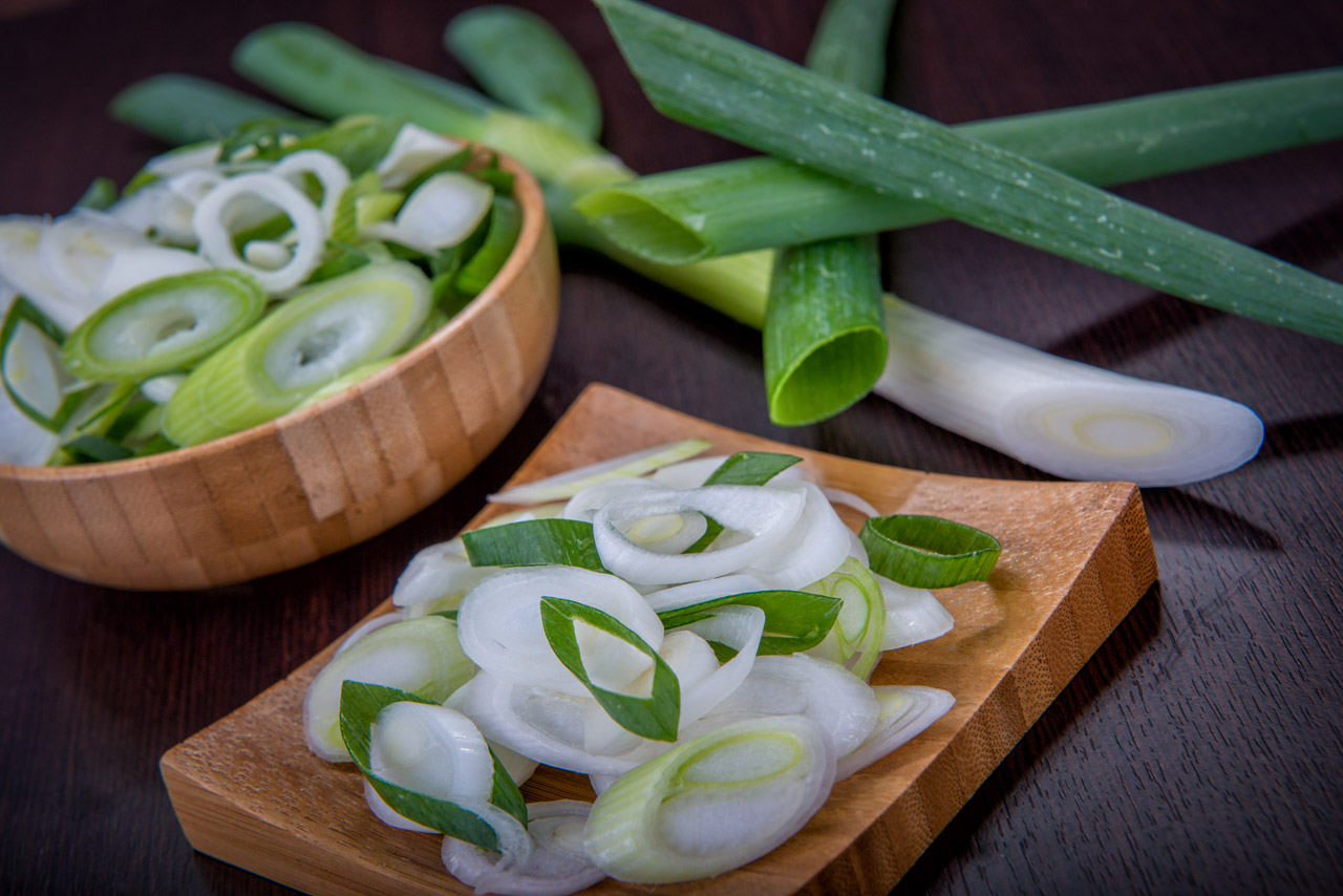 Cipolle porraie (sponsale salentino) pulite, lavate e tagliate, pronte per essere utilizzate in cucina o mangiate.